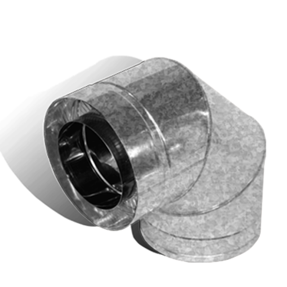 Коліно 90° 150/220 мм застосовується для повороту димоходу. Матеріал виготовлення внутрішньої труби - нержавійка товщиною стінки 0,5 мм, зовнішня труба - оцинковка товщиною стінки 0,5 мм. Теплоізоляція: базальтове волокно 30-35 мм. Всі елементи димоходу з'єднуються хомутами.
